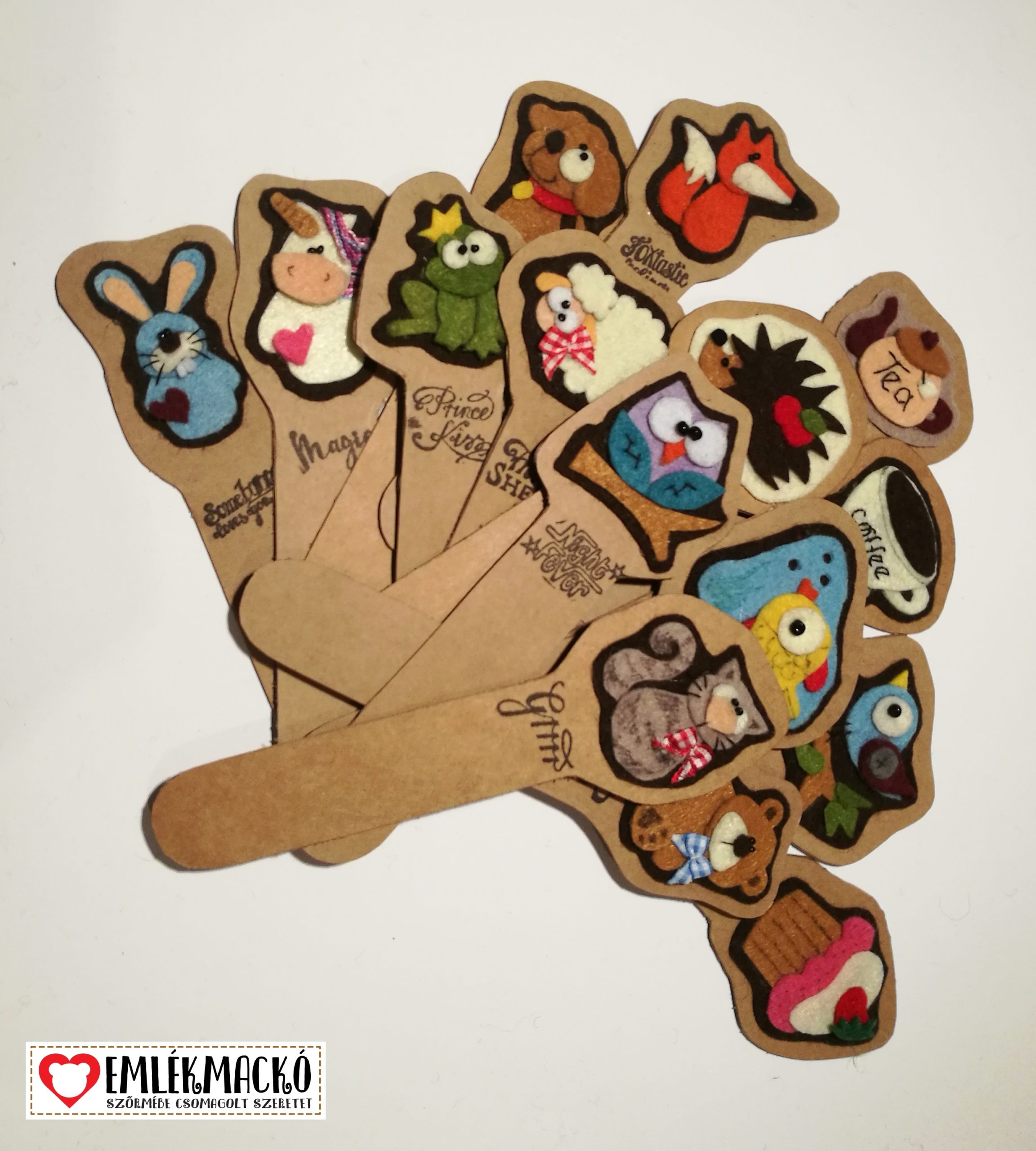 Natúr, kraft karton könyvjelzők 15 féle figurával és a hozzájuk tartozó felirattal.